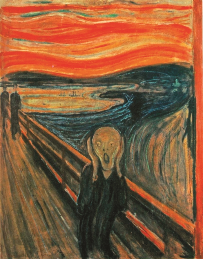 Ya da Edvard Munch'un orantısız çizgilerine ve kıvrımlarına eşlik eden mavi ile turuncu kontrastının yarattığı dehşet duygusana ne demeli?