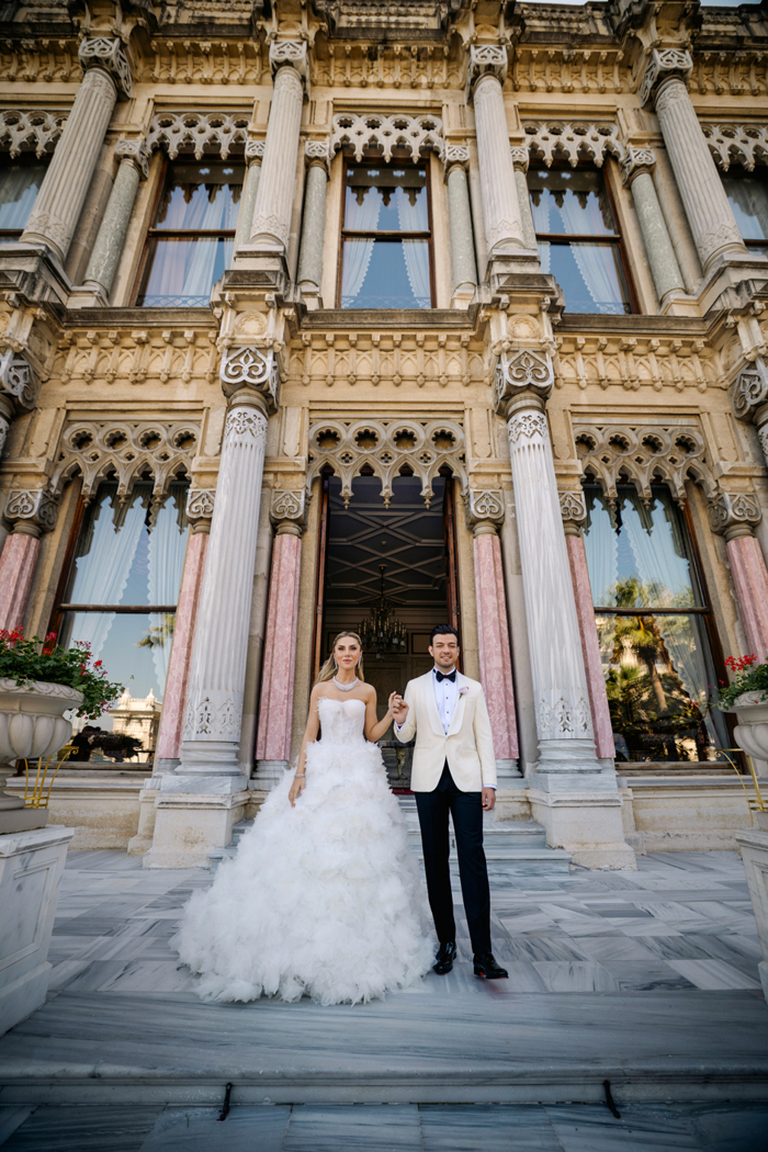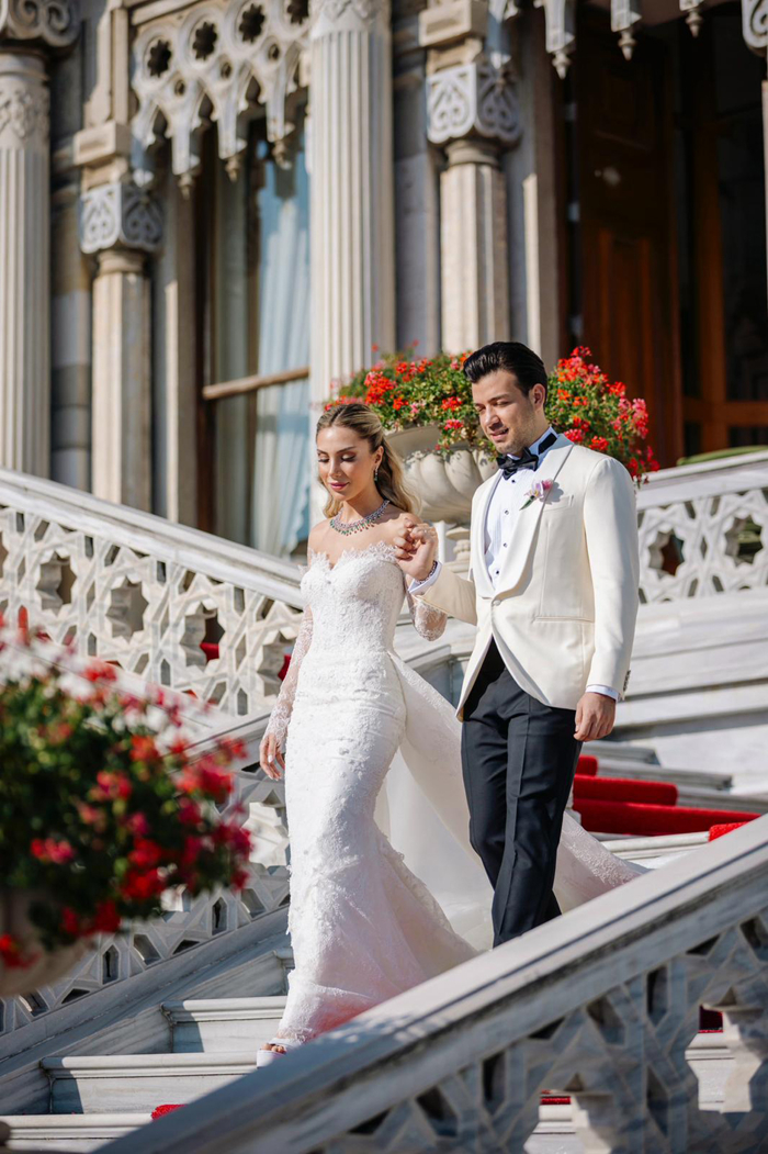 Sinem Kiracıoğlu, nikah töreninde tercih ettiği dantel detaylı gelinliğiyle sade ama çarpıcı bir görünüm sergiledi. "Evet" anında havaya karışan renkli konfetiler, Boğaz'ın romantik fonuyla buluştu. Kiracıoğlu ilk dans öncesi prenses model kabarık ikinci gelinliğine geçerken, Mehmet Ustaoğlu ise klasik tarzıyla öne çıktı.
