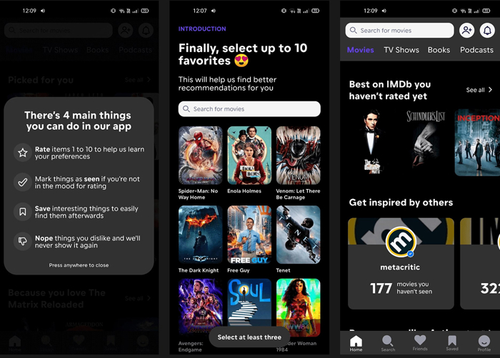 Friendspire uygulamasını kullanmaya başlamak için önce bir hesap oluşturmanız gerekir. Burada atabileceğiniz birkaç adım var ve uygulamanın size daha sonra geçmişte keyif aldığınız filmleri, sevdiğiniz türleri seçebilirsiniz.