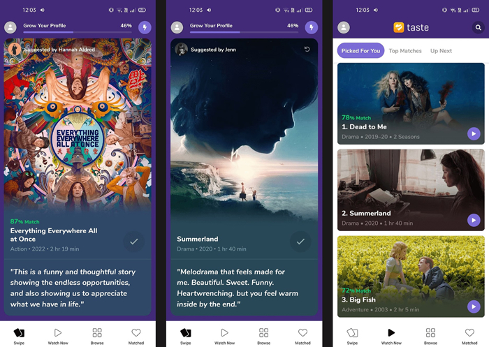 Birçok yönden Taste, Tinder gibi çalışır. İzlemek istediğiniz film önerilerini kaydetmek için sağa, atlamak için sola kaydırın. Öneriler, Taste'in sizinkine benzer tercihlere sahip olduğunu düşündüğü diğer kullanıcılardan geliyor.