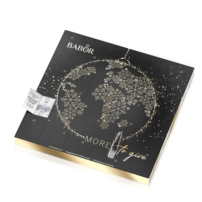 Babor Ampul Konsantreleri 2022 Noel takviminde genç, parlak ve güzel bir cilt için 24 sürpriz var! Yüksek konsantre aktif bileşen gücü sayesinde görünür sonuçlar için her kapının arkasında, cildinizi şımartmak için bekleyen özel bir aktif bileşen ampulü bulunuyor. Bu kez önceki yıllardan farklı olarak kapıların arkasında sizleri iki tip Doctor Babor Power Serum ampul de bekliyor. Olağanüstü güçlü kozmetik aktif bileşenlerin hassas sinerjisi ve dünyaca ünlü ampullerin yüksek konsantre aktif gücü sayesinde, güç ampulleri her cilt sorunu için daha da fazla etkinlik sunuyor. Takvim, gezegenlerimizi zarif, klasik siyah ve altın rengi bir tasarımla kutluyor: Parlayan altın yıldızlarla çevrelenmiş siluet, kıtaları betimleyen narin kar taneleri. Gelecekteki Noel sezonlarını garanti altına almak için, Babor'da çevreye saygıyı hem cilt hem de çevre için DNA'mızın bir parçası olarak görüyoruz - "daha fazlasını vermek". Bir kez daha takvimin iç kısmında hiç plastik yok!